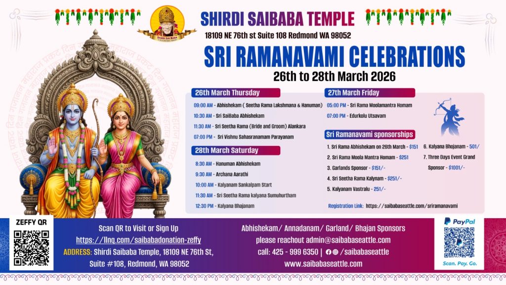 Sri Ramanavami Celebrations 18109 NE 76th St UNIT 108, Redmond, WA 98052 Start: 03/26/2026 End: 03/28/2026 Register / Payment Complete your registration using one of the options below. Zeffy Add to Calendar Google Outlook Apple Download .ICS Upcoming Events No upcoming events at this time. Events